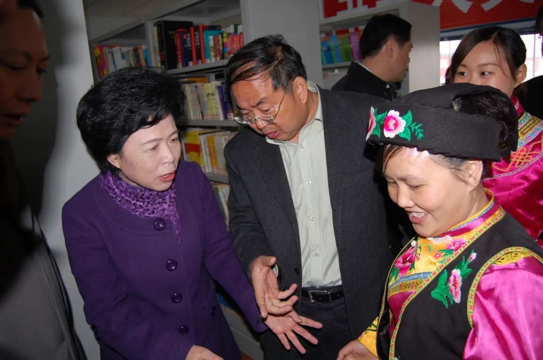 2010年3月24日,文化部副部长杨志今(右二)对北川永昌板房图书室的工作给予肯定(右一为本文作者李春)