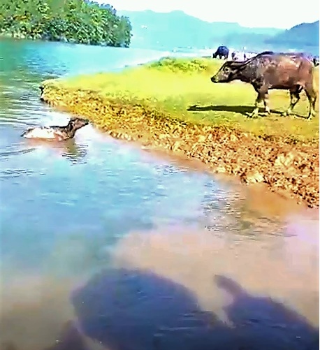今年又有游客拍到了一个感人画面:牛群大部队已快要接近江心岛,突然水中一头牛极速往回游。镜头拉回,原来有一头小牛害怕下水,还在对岸水边迟疑不决。可能它是第一次下水吧,回游的应该是它的妈妈。母牛义无反顾地游回小牛身边,给它示范下水游泳的动作,小牛在母牛的带领下,顺利游过了宽阔的江面,登上了江心岛。游客们都为母牛赞叹不已,也为小牛鼓掌。动物世界都如此母子情深,让人感叹唏嘘!