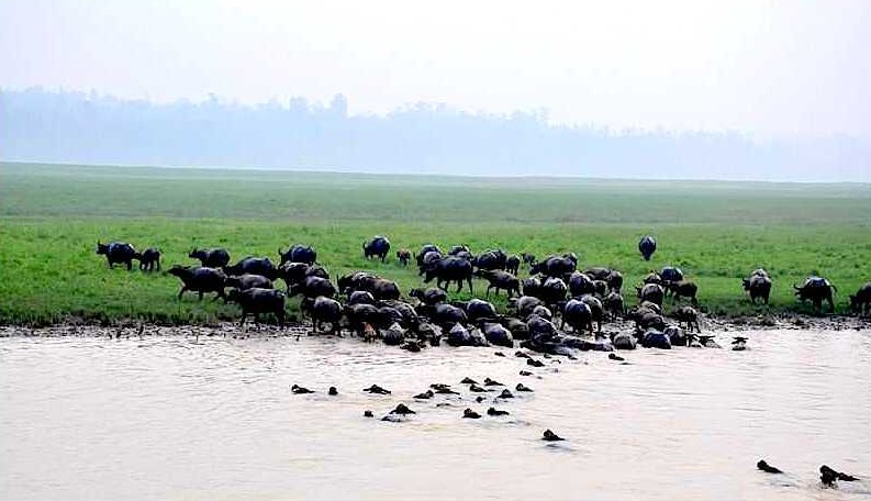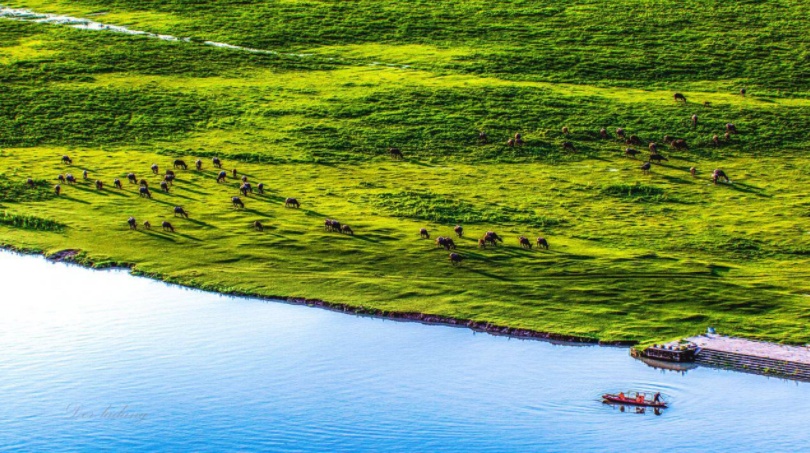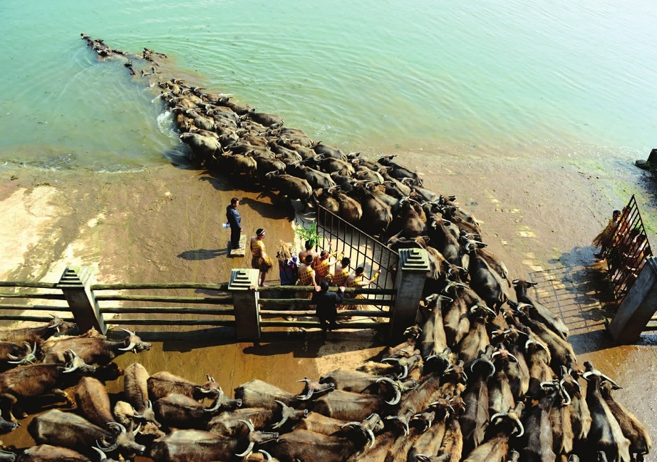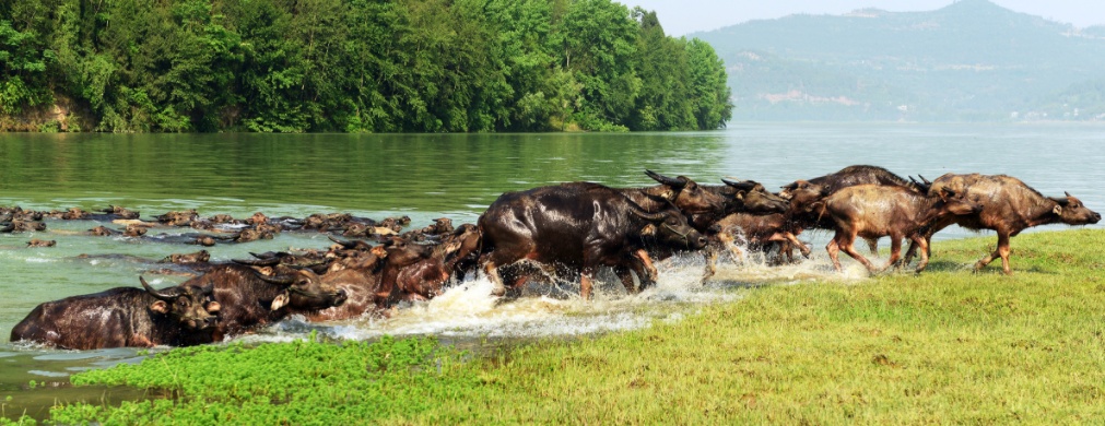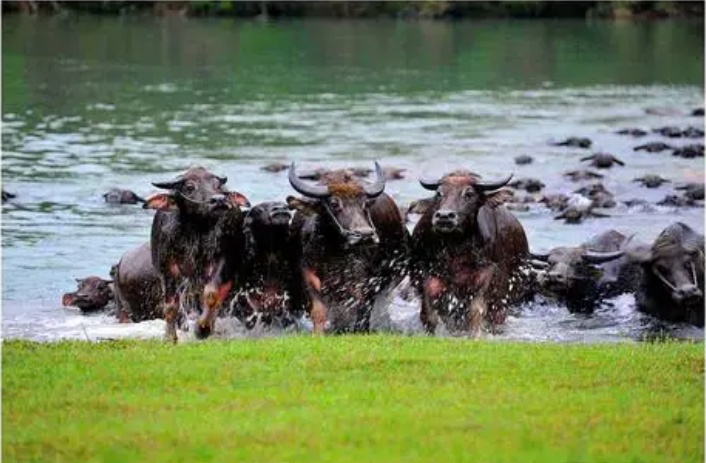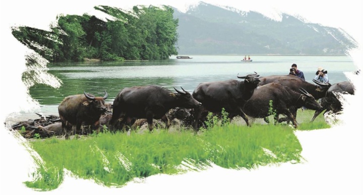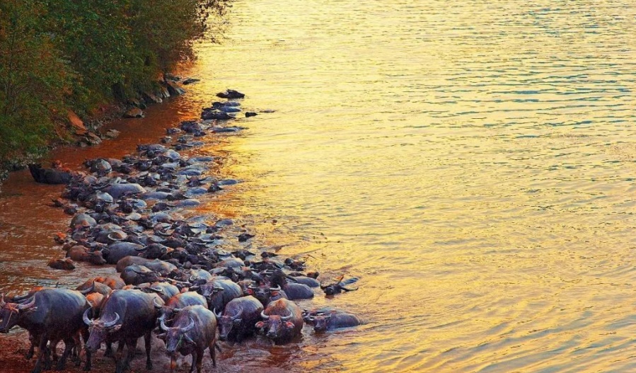 百牛渡江的奇特景观,演绎者是一群体格健壮的水牛,但是它们的集体活动非常有组织有纪律,在头牛的带领下,按照一定路线,游向青草肥美的彼岸。泅渡过程中,牛群彼此照顾,团结协作,母牛照顾小牛,体格健壮的照顾体弱瘦小的,一起奔赴它们的美食岛屿。