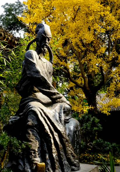 “草堂少花今欲栽,不问绿李与黄梅。”踏进园子就看见一块石刻题着先生的诗,莫非那沿河的柳,那簇笼的竹和参天的柏树是先生亲手所栽?我脑海里顿时浮现出一位衣著麻衣脚著布鞋,面容清瘦的老翁登门向邻居讨要花种的情景,“草木秋死,满园荒芜,可有种子,有所希翼?”