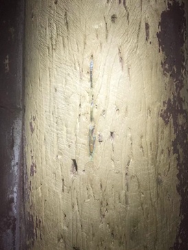 镶嵌在肖家房柱上的3枚铜板(罗燕红 摄)