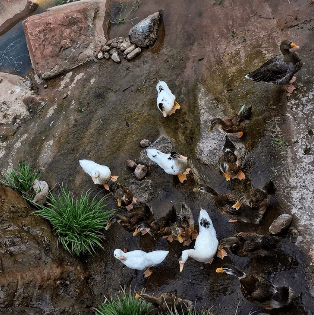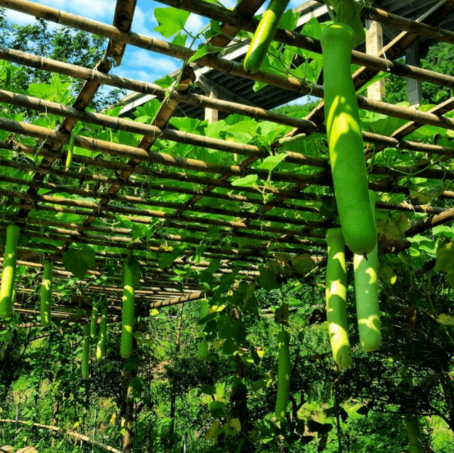 我心中的疑问在午饭后被解开了。吃过午饭,农场负责人带我们继续深入参观农场。一行人穿过一条由竹条和葡萄藤搭成的百多米长廊后,再爬上一个小山坡,眼前赫然是一排排排列整齐的鸡舍和蔬菜大棚,不用说,这些都是人社局的扶贫项目了。一路往前走,我留意观看那些鸡舍里的鸡和大棚里种植的蔬菜。每个鸡舍里喂养的鸡也就是六七只,但全都矮小健壮,活泼好动,不同于一般的农家土鸡。听农场负责人介绍我才知道,这些笼养鸡都是扶贫项目,优质良种鸡分配到村里的各个贫困户后,再集中喂养,而鸡和鸡蛋最终都是要统一回收的,不让贫困户们有一点点风险和后顾之忧。