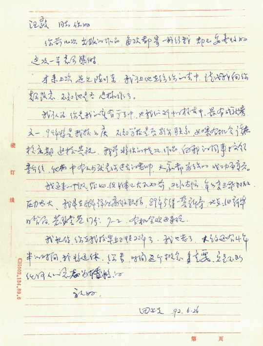 1992年6月26日,田正先老师致汪毅信