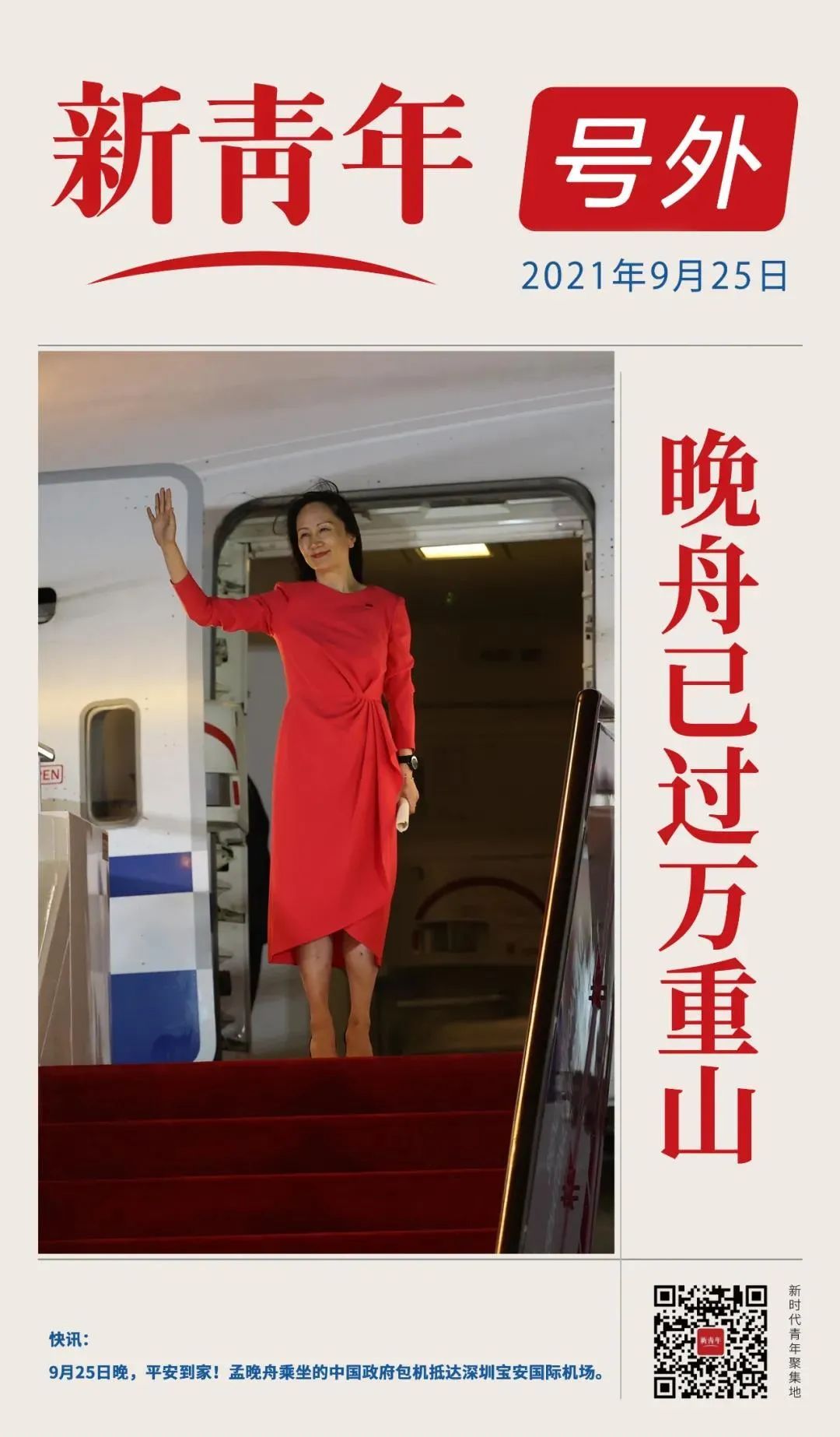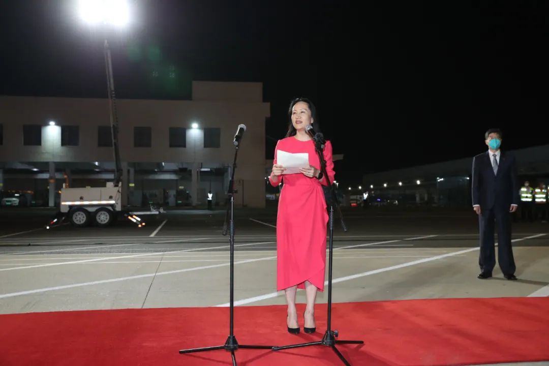 2021年9月25日晚,深圳宝安国际机场,现场迎接人群自发唱起《歌唱祖国》 ,孟晚舟一同合唱,眼含热泪挥手
