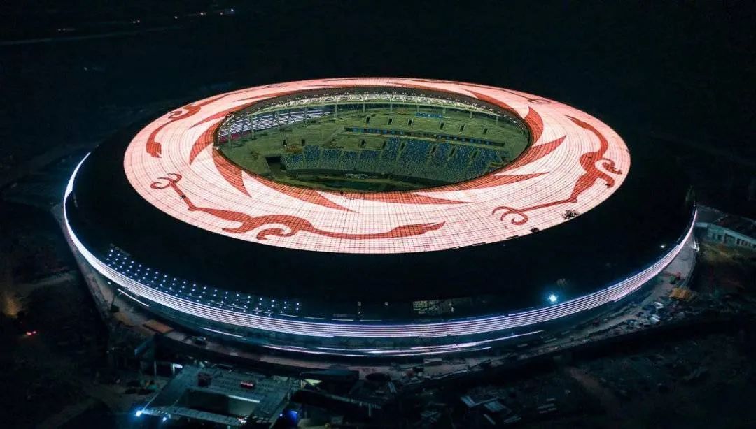 第31届世界大学生运动会主场馆上的太阳神鸟图案(图片来源:成都世界大运会公众号)