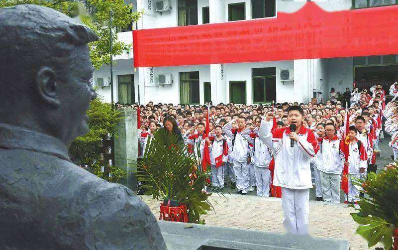 两弹城邓稼先旧居前,学生向邓稼先塑像敬献花束并庄严宣誓(李向雨 摄,图片来源:四川日报)