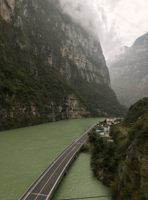 我们驱车行驶在大渡河沿岸的公路上,感觉处处皆是美景,让人目不暇接。谷底下的水上公路伴着碧绿的卧波,蜿蜒伸向座座大山。