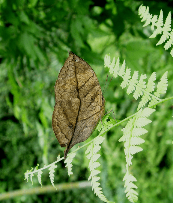 另外,在报国寺、长老坪、善觉寺、万年寺、清音阁一带,也可见到枯叶蝶的身影。其实在1980年之前,川西南山区如瓦屋山、青城山也常见枯叶蝶。仔细观察,它停息之时,两面“三刀翅”紧紧收缩竖立,将身子深深地隐藏,展示出翅膀的腹面。这种隐身术远远高于鸵鸟埋沙,因为它腹面全是古铜色,在秋天酷似一片枯叶,且常常随着季节的更替而变化,色彩和形态都和树叶无异。一条纵贯前后翅中部的黑色条纹和细纹,很像树叶的中脉和支脉;后翅的末端拖着两条和叶柄十分相似的“尾巴”,静止在树枝上,很难分辨出蝶与叶。
