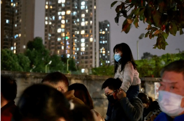 11月8日晚,成都部分区域居民排起长队做核酸检测(图片来源:成都发布《灯火通明,齐心协力守护烟火成都》)