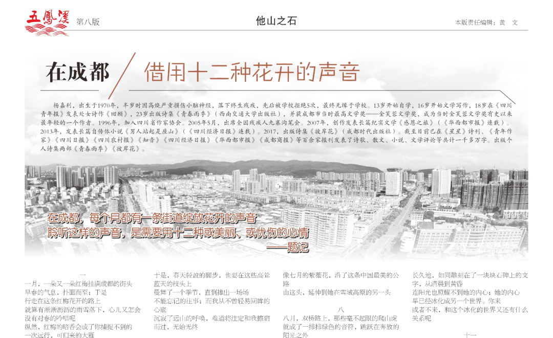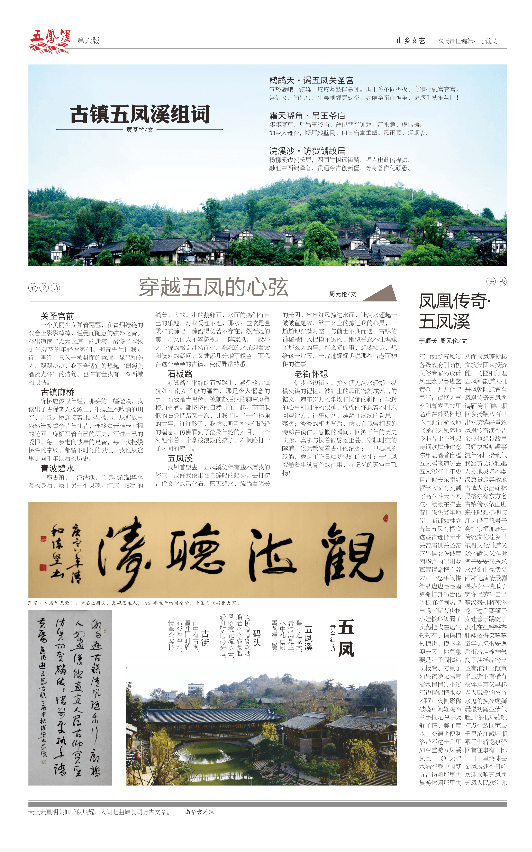 每年我订阅及收到的报纸杂志上百种,但是我却集“万千宠爱于一身”——特别喜欢看《天府边城·五凤溪》。我与《天府边城·五凤溪》相识相知已三年,三年里,每每看她,犹如进入六度空间。