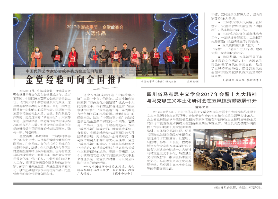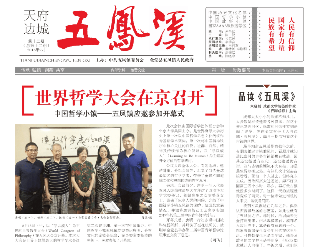 一张乡镇报纸,却有能力打造迷人的六度空间,这是为什么?我想这和它的定位有关。第一个定位是级别定位:办成国家级的报纸,致力丰富中国历史文化名镇、国家AAAA级旅游景区的文化内涵。这,已经做到了;第二个定位是报纸当成杂志办,文章有如小说看,图片体现艺术范,每期系统又连贯,众所周知,这也是做到了的;第三个是编辑与作者的定位。《天府边城·五凤溪》的采编人员为作家、贤达、语言工作者、行业精英等,作者则为各级报纸杂志的编辑记者,科研院所的专家学者,更有各级领导、青年才俊等一文学爱好者。