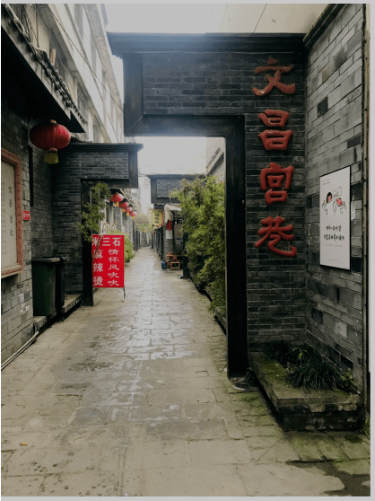 与大椿巷相距不远处,有一条文昌宫巷。该巷子内的文昌宫建于清乾隆十年(1745年),占地约3亩,原为二进四合院会馆类建筑。巷内的文化墙上贴满了各个历史时期的档案资料和相片,一则则公函、一张张合影,向人们展示了唐昌千百年来的历史文化风貌。许多外地游客不禁惊呼“太难得一见啦”“我活了六十几岁还是第一次见到这样的景象”!