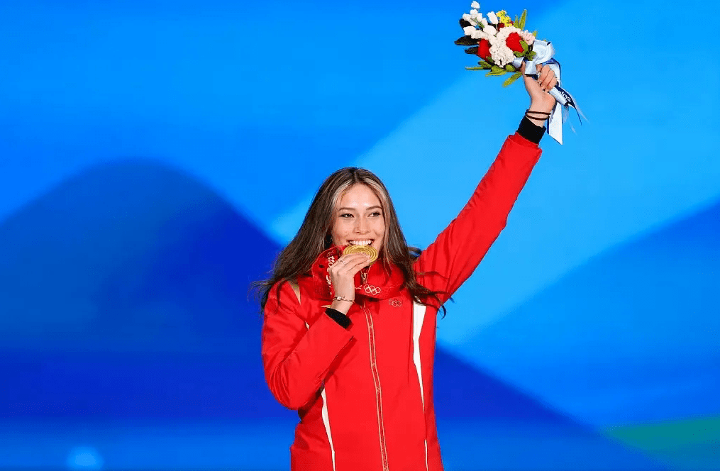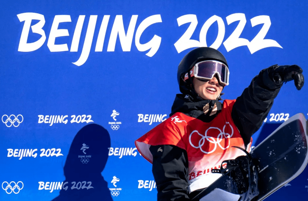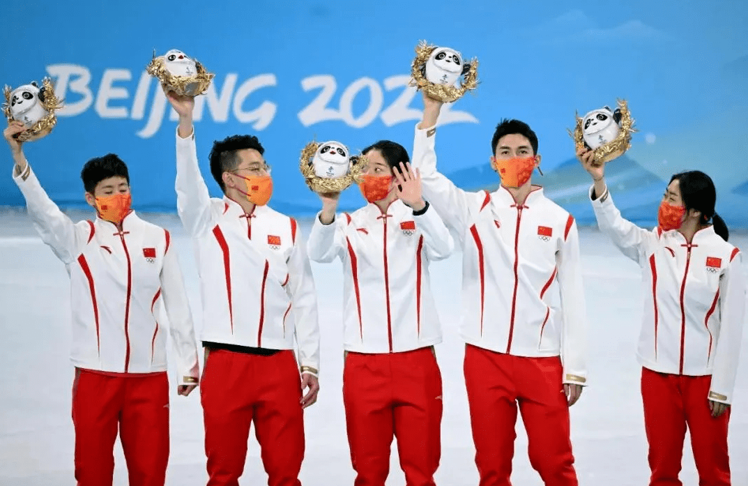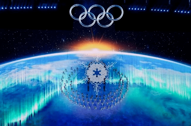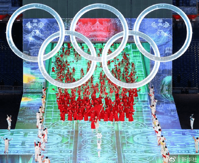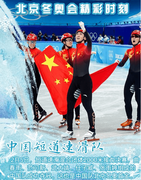 健将逞英豪。环宇争超。雪飞冰舞唱妖娆。冬奥同心融盛世,中国红飘。