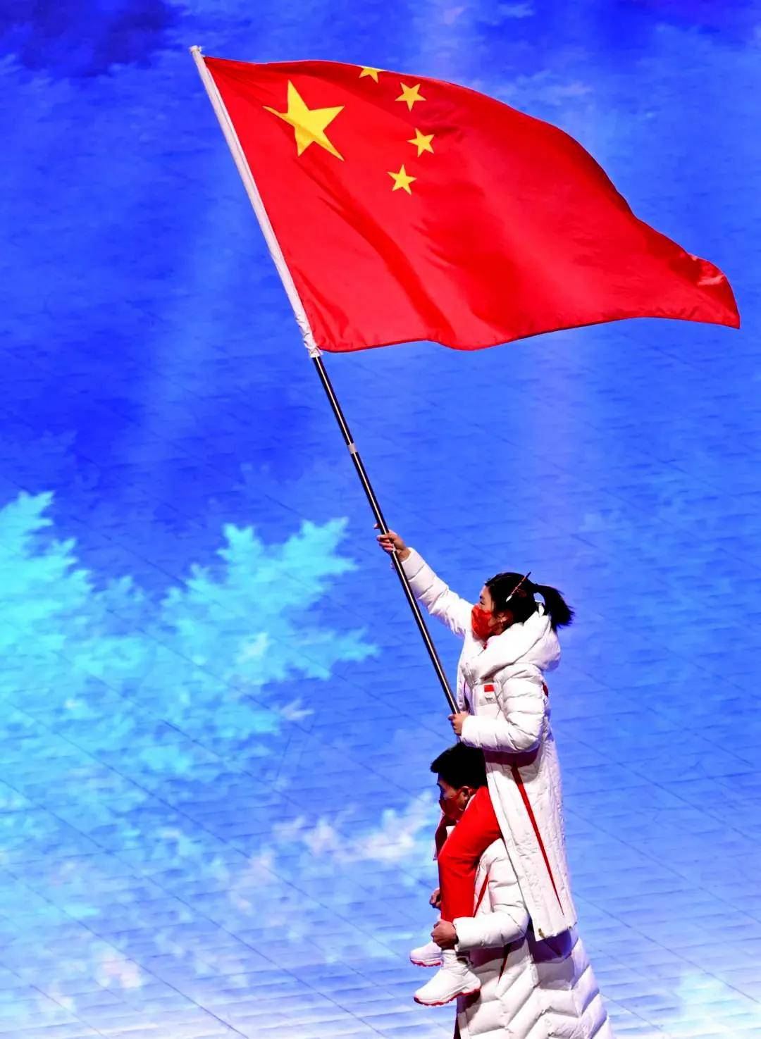 2022年2月20日晚,中国代表团旗手徐梦桃与高亭宇在闭幕式上入场(图片来源:新华社)