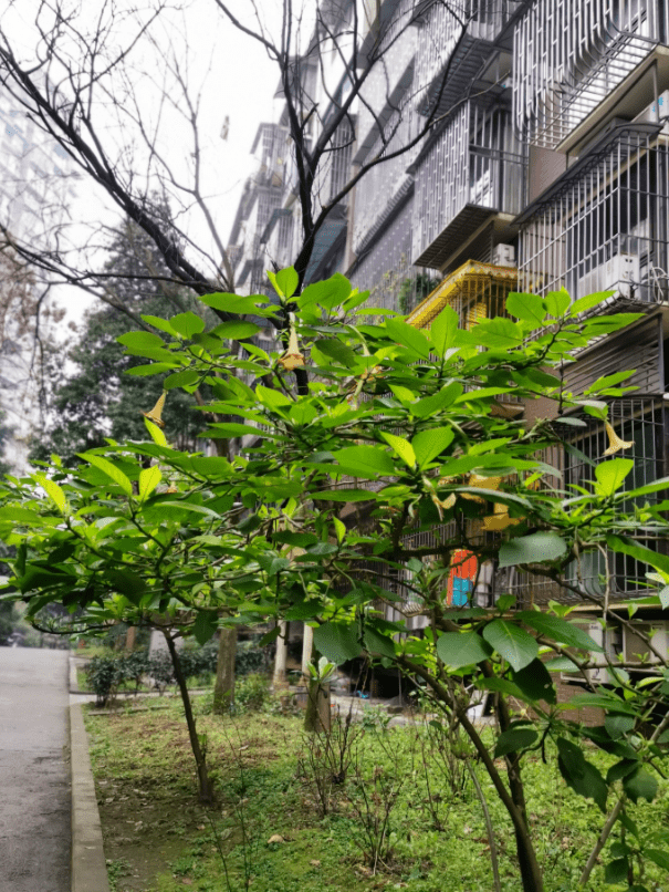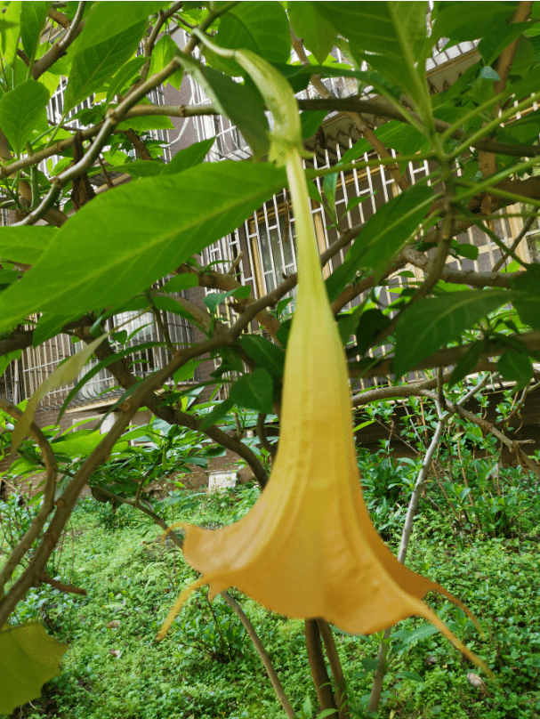 带着疑惑,我站在这两株曼陀罗树下,认真端详,仔细琢磨。4年前的8月,为了孙儿上学,我们举家搬进了这个学校附近的小区。意外发现,靠中庭的一户人家窗前竟栽有两株曼陀罗,虽然,花开接近尾声,但我还是很欣赏它倒挂金钟般的硕大壮艳。