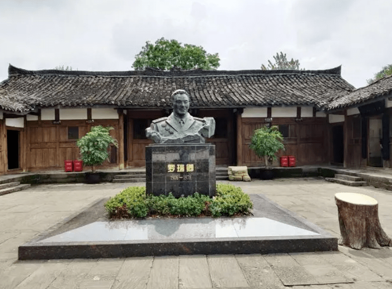 1906年5月31日,罗瑞卿就诞生在这里,并在此生活了20年,然后离家出走,参加革命。远看故居,貌似并无任何特别之处,典型的川北农村民居,三合院式木结构穿斗青瓦房,木板门,木板墙,房屋坐南朝北,正对嘉陵江,正中是堂屋,两侧是正房和厢房,西侧是将军以及将军父母的卧室、厨房及杂物间。与众不同的是,房屋的屋脊上一字排开竖着堆满了十余米长的青瓦,密密地覆压脊梁之上。我想如果没有铮铮铁骨般的脊梁,恐怕也难以承受长龙一般整齐排列的屋瓦之重吧。故居前院坝的正中,屹立着罗瑞卿将军半身铜像。将军面容慈祥,目光睿智,与其说那是一位曾叱咤风云的共和国开国大将,倒不如说那更像是一位地地道道的农村里常见的朴实无华的清瘦的教书先生,文质彬彬,目光睿智,和蔼可亲地打量着每一位前来参观的造访者。