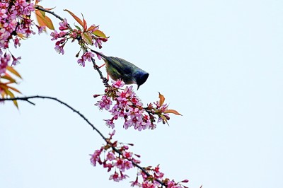湖南省龙山县,花儿开放,引来小鸟“闹春戏花”。新华社发