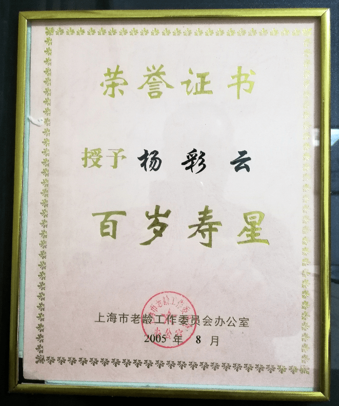 2005年8月,上海市老龄委授予魏伯良将军母亲杨彩云“百岁寿星”(刘玉莲 供图)