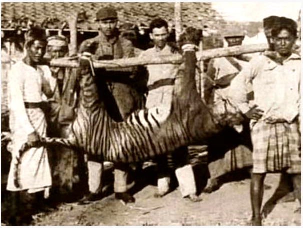 1911年11月3日,一只怀胎待产巴厘雌虎被射杀,头中三枪,其中一颗子弹击碎眼珠穿眼而过,众人抬着这只雌虎走向当地政府卖了高价