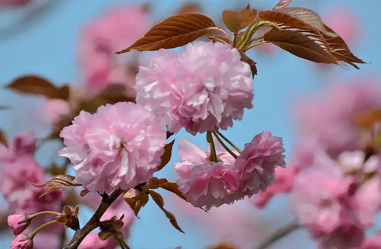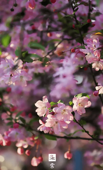 远看时,花朵与新叶层层叠叠,密密地洒在水墨画般的树枝上,像朦胧的云朵,像织就的轻霞。近看时,花朵一簇一簇地和绿叶相拥着生长,粉嫩的花瓣只有少部分还凑在一起,其余大都尽情开放,当光透过薄薄的花瓣,花朵看起来娇艳欲滴,像在发光。日出时,花朵欣欣然立于枝头,迎接晨光,吐露芬芳,朝气蓬勃。日暮时,花朵被路灯柔和的光和夕阳同时眷顾,花藏匿于朦胧的光晕之中,如油画一般。看到此景,人们往往会出神,突然就想起余光中先生说春天是发呆的季节。
