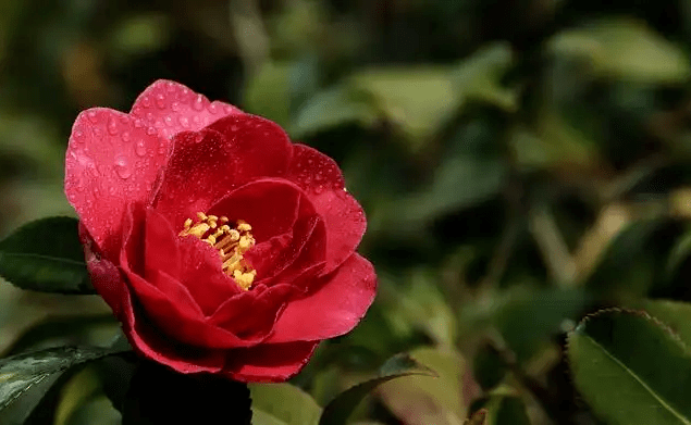 烟雨朦胧时,茶花在山林间显得更加独特耀眼。红茶花将整个江南都衬得格外诗情画意,有着油画般的复古质感。千年茶花梦,愿得一日开。雨点重重砸在花瓣上,片刻便湿了全身,“东园三月雨兼风,桃李飘零扫地空。唯有山茶偏耐久,绿丛又放数枝红”。别的树下花瓣铺地时,它依旧娇艳欲滴,也依旧全身而退,风吹雨打不凋零。来时硕果累累季,归时繁花点点时。这便是山茶花,它走过别的花儿不敢走过的路,也用力将自己的美丽留在世间。