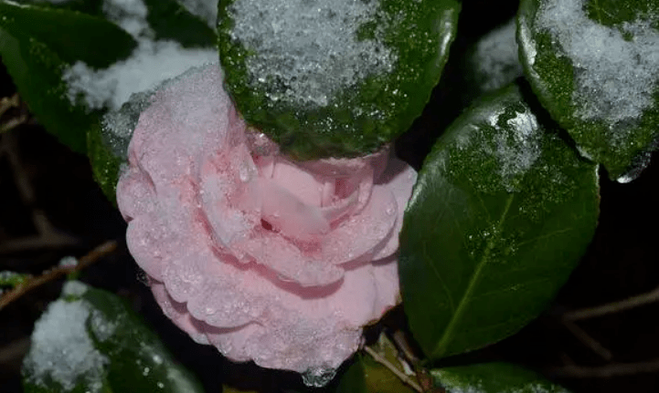 茶花的花期一般是十月至来年五月,花期甚长。“独放早春枝,与梅战风雪”。茶花和梅花一样会经历严寒,经历绝境才得到重生。世人好像都在赞美梅的坚韧傲骨,却忘了茶花也奇路难行。“老叶经寒壮岁华,猩红点点雪中葩。”茶花艳而不妖,身在风雪中片叶未落,婷婷静立。我爱茶花绽放的绚烂,也爱茶花在白雪中的凄凉艳美。虽无人问津,但在寒凉中长得愈发强壮。茶花一开,便是冬季将至,新年的希望也就重启。熬过了凛冬迎来了生命又一次春光。