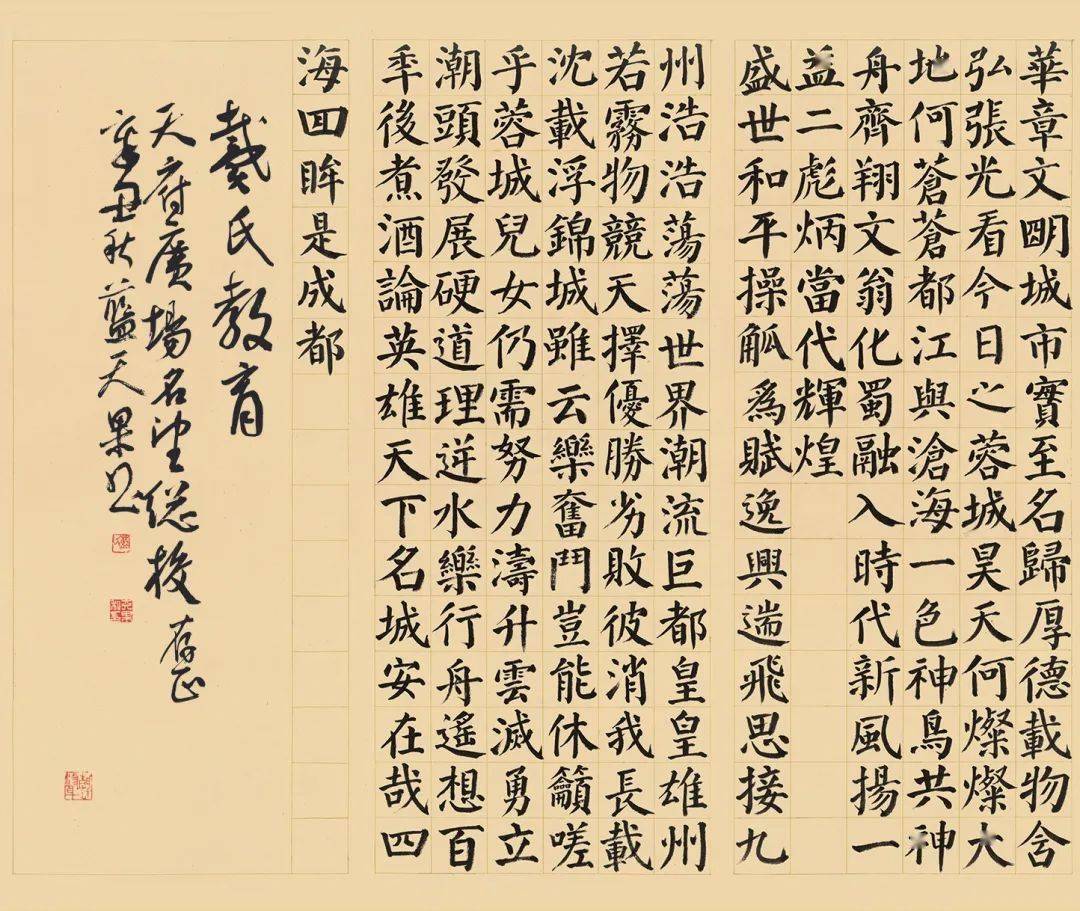 上图书法作品是 蓝天果先生近期创作的一幅书法长卷作品,内容是四川省著名词赋家何开四先生撰写的《成都赋》。此作长约720cm,宽105cm,主体部分1300余字。作品以篆隶书标题,体现成都历史悠久,行草题落款行云流水,润物有声,唐楷写正文,具庙堂之气,正气凛然。