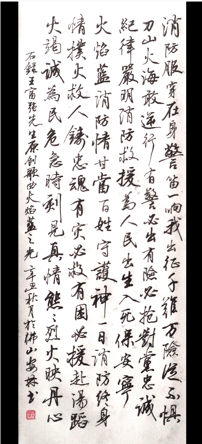 王富强说,消防救援卫士是和平年代距离老百姓最近的一支队伍,是美丽的逆行者和岁月静好的守护人。发生火灾时,人们都会立即拨打“119”报警;遇到险情时,人民群众也会第一时间想到向消防救援队伍求助。每次在抗洪、救灾、抢险等灾害现场,都能看到他们的身影。他们不怕牺牲,不怕困难,用实际行动为人民排忧解难,和时间赛跑,与死神较量。他们用自己的坚毅,筑成了一道道坚固的围墙,守护着每一个家庭!为写好这首歌,王富强先后6次深入到消防救援一线和基层消防救援大队去体验和采风,搜集创作素材,捕捉创作灵感。