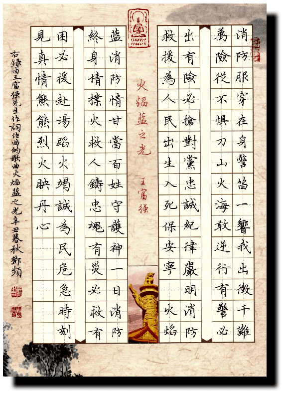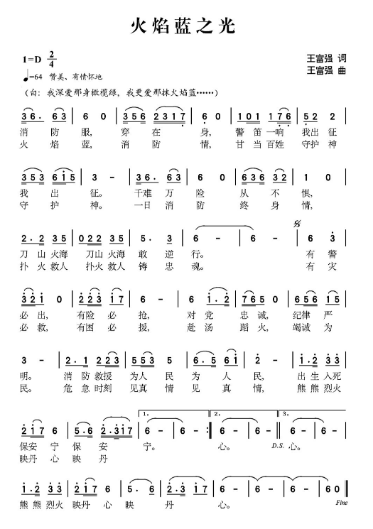 “消防服,穿在身,警笛一响我出征,千难万险从不惧,刀山火海敢逆行……”国庆期间,一首情感充沛、悦耳动听的歌曲《火焰蓝之光》在互联网和微信群里热传,受到广大听众朋友们关注和喜爱。