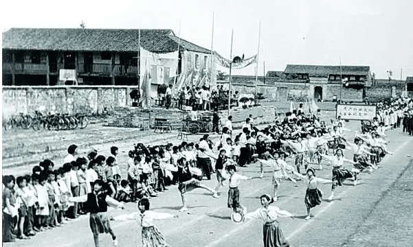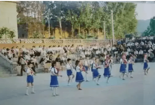 我们在大街上游行:身着白衬衣、篮下装、白胶鞋的我们满脸童真,童口童音,一路欢呼……像一群晨起争着鸣唱的雀鸟。