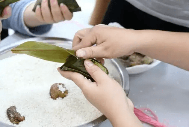 遗憾的是,我却没机会跟外婆学包粽子,因为她都是在端午节那天上午包,说是现包现煮的才更香、更好吃。好不容易遇到一个端午节恰好在星期天,我们四姊妹都围着外婆,看着她把浸泡好的糯米捞在筲箕里沥干,准备好配料,然后拿起两片粽叶,交叉叠成漏斗状,放入糯米,再往中间按进去一颗红枣,几粒红豆和花生米,之后小心地翻折叶片,把口封上,再用红黄蓝绿等彩色棉线捆住,包好了,放进锅里开始煮。大大的锅盖,掩不住粽香四溢,很快,所有房间都是满屋芬芳。