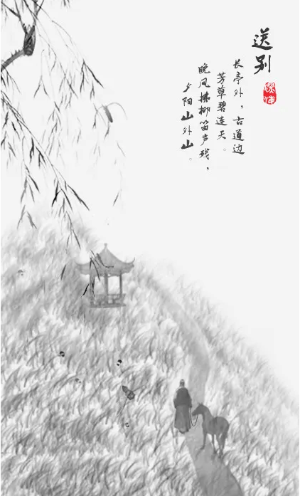 于是,再现长亭送别。李叔同为友许幻园谱离歌“长亭外,古道边,芳草碧连天”,一首至真至诚的《送别》,更添了一层冷落凄清的意境。同为送别的高适在《别董大》一诗中,尽显清新明快却豪迈了不少,“莫愁前路无知己,天下谁人不识君”,至真至诚,别具一格,堪称完。