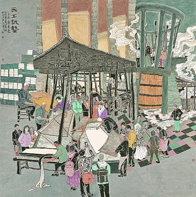 作品《天工纸艺》聚焦了夹江手工竹纸的制造。画家尹莉莉在充分了解竹纸复杂制作工艺的基础上,将造纸过程中的重要环节在画面中一一呈现,并将现场观摩学习的大学生、游客一并入画,在生动呈现巴蜀传统手工艺的精妙之美的同时,点明了“传承工匠精神”的思想主题。此外,邓枫的《开往春天的火车》设色典雅,朱沙的《晨光》光影流转,孔祥忠的《唐时宫廷酒 今日剑南春》构图别致,创作者们以独具个性的表现方式,将四川工业历史中的文旅萌芽进行捕捉,令嘉阳小火车、自贡井盐深钻汲制技艺和蒸馏酒传统酿造技艺等具有代表性的四川工业遗产和国家级非物质文化遗产,以崭新的艺术面貌呈现在我们面前。