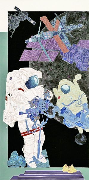 钟昱的《离弦之箭》聚焦我国三大航天发射中心之一的西昌卫星发射中心;李青稞在深度调研成都龙泉国际汽车城后,挥笔创作了《西部生产线》;黄家学笔下的《华龙一号》取材于这条核动力巨龙中的“四川造”蒸汽发生器……在描绘时代新貌的同时,艺术家们不忘探索艺术语言的多样形式,在现实主义题材创作中融入浪漫主义情怀。余剑恒在创作《西成高铁》时,运用巧妙的构图设计,使三星堆与兵马俑在高铁驶过的瞬间产生“对话”。作品《九天揽月》表现了中国宇航员进行太空作业的场景。作为一名有着山区支教经历的画家,作者刘春亭特意在画面下方描绘了一双放置在阶梯顶端的童鞋,寓意孩子们朝着航天梦一路攀登。漫步展厅,移步异景,美术家们的创作涵盖了正在腾飞发展的中国工业的各大重点领域。这些以数字经济为核心、以高科技产业为主体的“四川名片”,是新时代强国风貌的极佳体现。
