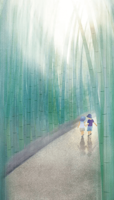 竹林只有每个暑假才会那么热闹,暑假时有许多孩子在林中玩,有过路的行人在林中休息吹风,还有蝴蝶蜻蜓,地上也会开满毛茸茸的黄色花朵和一些奇奇怪怪的花。有个暑假,我学着电视上的秋千模样在竹林中也弄了一个,和弟弟妹妹玩。但板凳总是母亲在黄昏时给我们带回家。那个时候,我觉得每次路过这里,砍柴的人休憩时没有垫子,便用粽叶铺了长长的一条,可是这些垫子总是不翼而飞……