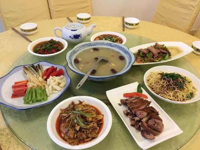 中午,天师招待委员长一行。席间上了青城四绝:洞天乳酒、白果炖鸡、道家泡菜和洞天贡茶。饭后,在洞天静室,蒋介石、蒋经国父子呷着清香的青城贡茶聊天。