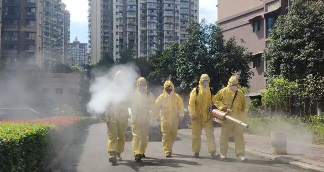 防控人员为小区消毒(图片来源:乐山新闻网)