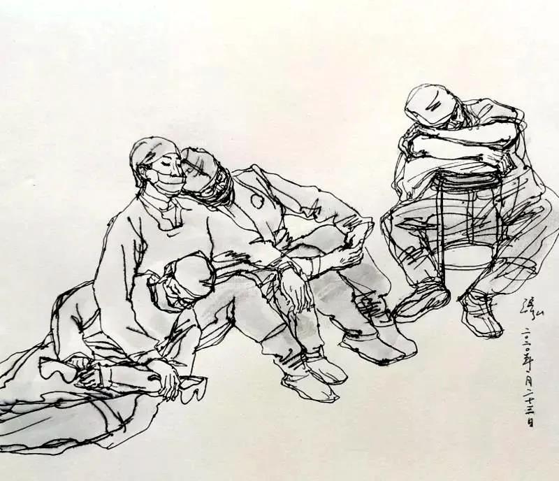 《疲惫的医护人员席地休息》 张弘 速写(图片来源:中国艺术报)