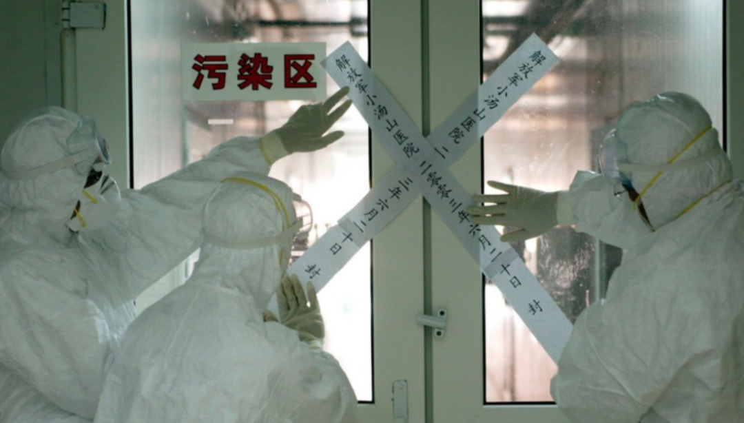 2003年6月20日,北京小汤山医院的医务人员为彻底消毒后的病房贴封条(图片来源:新华网)
