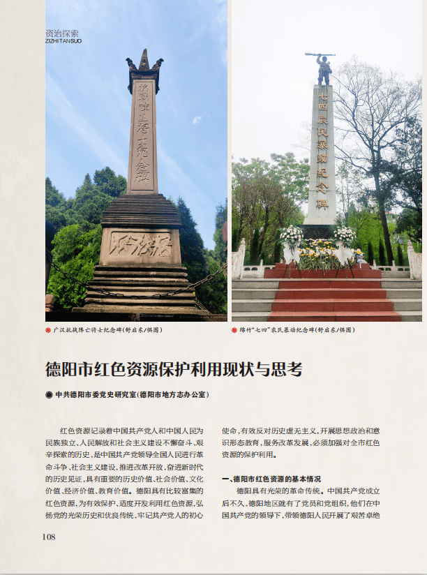 德阳具有光荣的革命传统。中国共产党成立后不久,德阳地区就有了党员和党组织,他们在中国共产党的领导下,带领德阳人民开展了艰苦卓绝的反帝反封建、推翻国民党统治、翻身求解放的伟大斗争。中华人民共和国成立后,德阳进入社会主义建设和改革开放时期,从20世纪中期的“德阳工业区”建设到德阳建市、从广汉农村改革到打造“改革开放高地”、从国有企业改制到打造“智能制造之都”、从抗震救灾后恢复重建到成德同城化发展、从脱贫攻坚到融入成渝地区双城经济圈建设,党又领导德阳人民在这块土地上书写了“敢教日月换新天”的锦绣篇章。德阳也因此成为红色资源的富集地,不但数量众多,且不少在党史上有着重要影响和重要地位。如:投身五四运动、首译《资本论》的陈豹隐故居,曾赴法勤工俭学、邓小平入团介绍人和党的早期领导人之一的萧朴生故居,德阳第一个支部——绵竹支部遗址,土地革命战争时期党领导的“七四”农民暴动纪念碑,广汉起义、孝泉兵变、文家桥暴动等党领导的武装斗争遗址,还有王铭章率军出川抗日的誓师遗址,特级战斗英雄黄继光的故居和纪念馆,广汉农村改革历史陈列室、汶川特大地震抗震救灾遗址等。
