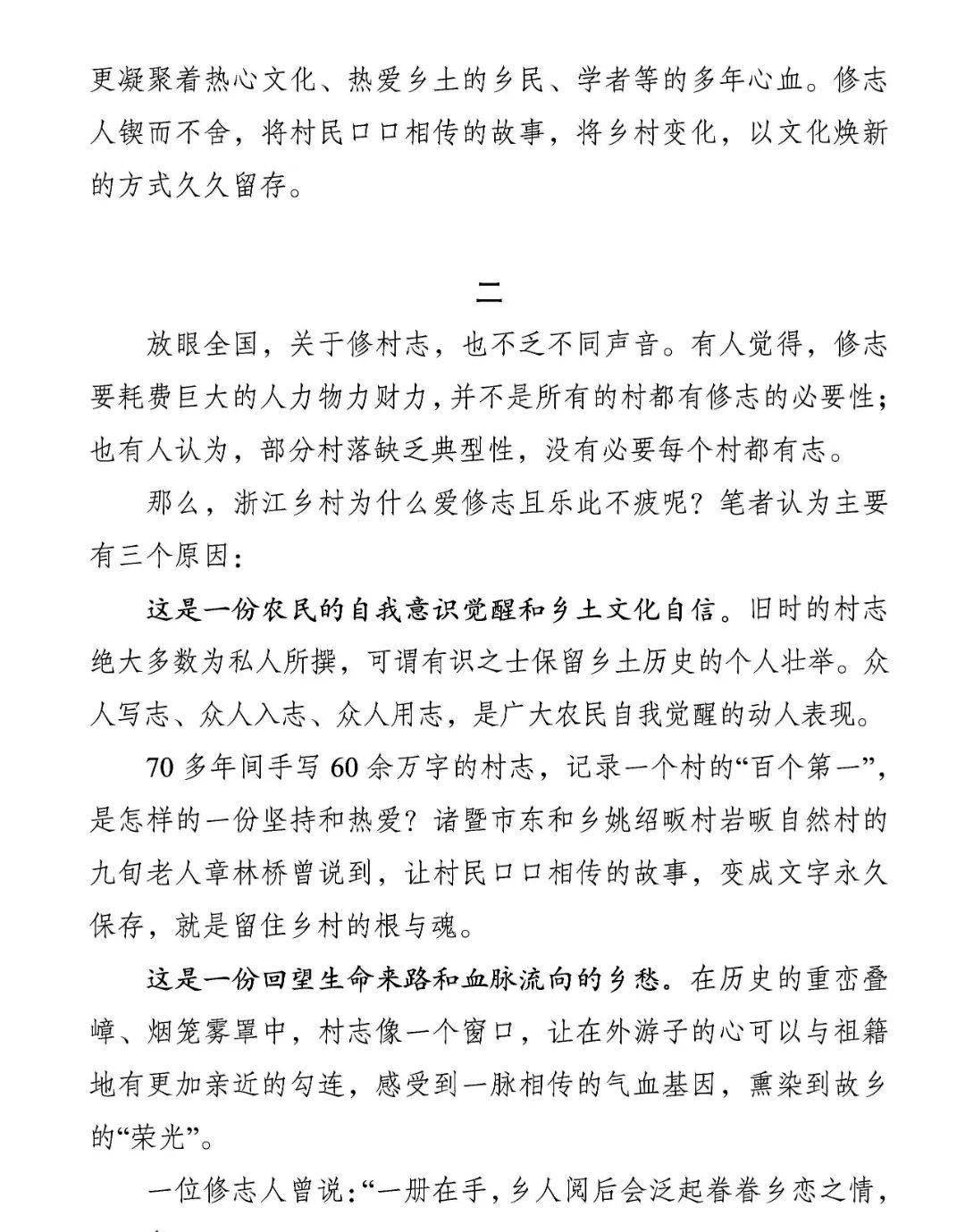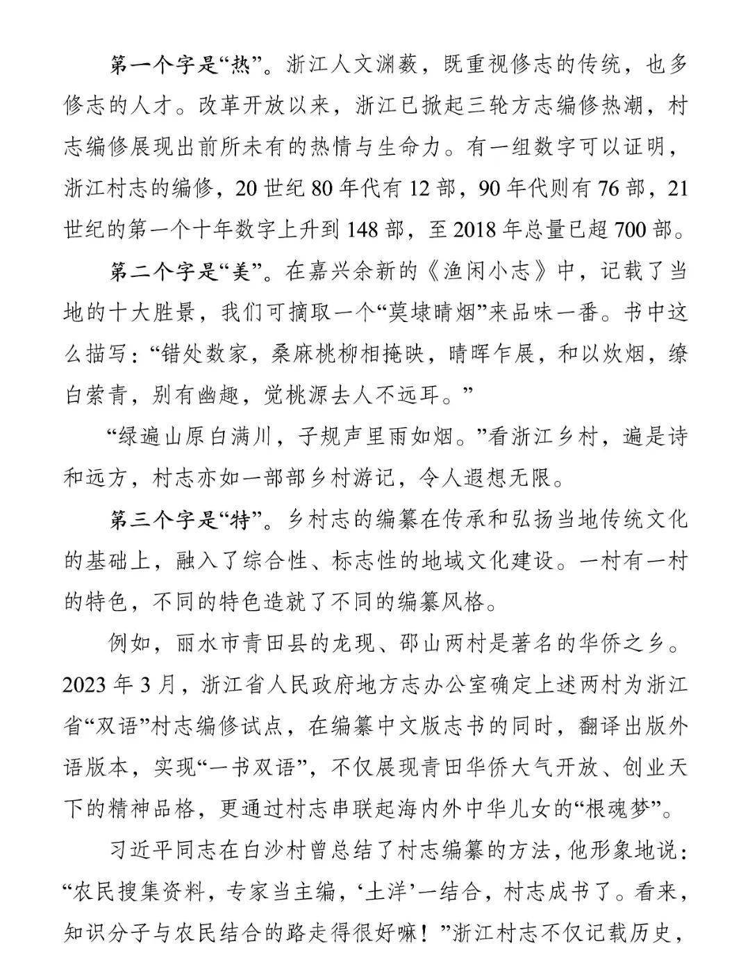 编者按:乡村文化、农耕文化是中华优秀传统文化的根脉所在,它们共同构成了丰富多彩的乡村文化体系,维系着中华民族最深层的集体记忆。振兴乡村必须保存好、挖掘好乡村文化、农耕文化,修志则是保存和挖掘乡村文化、农耕文化极为重要的途径。中共中央办公厅、国务院办公厅印发的《“十四五”文化发展规划》提出:“加强农耕文化保护传承,支持建设村史馆,修编村史、村志,开展村情教育。”乡镇(街道)志、村(社区)志是省、市、县三级志书的延伸和补充,是反映各乡镇(街道)、村庄历史变迁和发展成就,赓续乡村文化血脉的重要载体。2023年5月1日,浙江省委宣传部主办的“浙江宣传”微信公众号发布《浙江乡村为何爱修志》一文,从编修村志的意义、编修村志的必要性、如何让村志发挥更大价值3个方面介绍了浙江在村志编修方面的经验做法,对我们进一步提升思想认识,充分调动社会各方面积极性,做好全省正在开展的乡镇(街道)、村(社区)志编修及利用,提供了很好借鉴。现全文转载如下,供参阅。