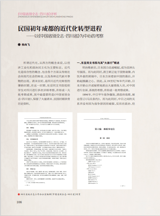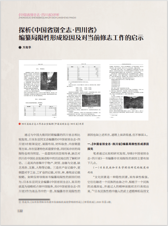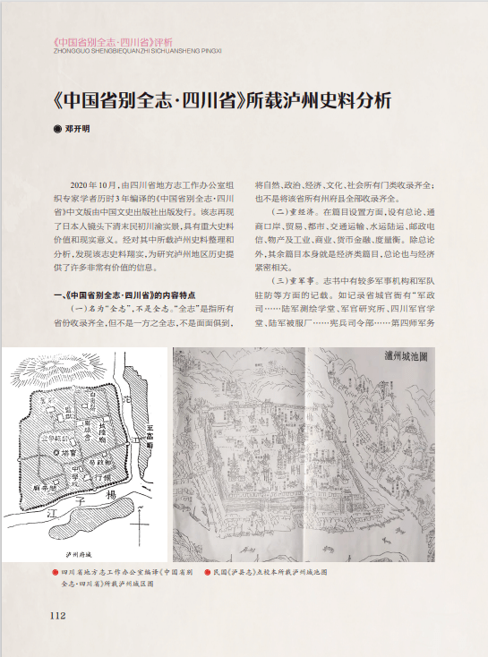 “《中国省别全志·四川省》评析”是四川省地方志办组织全省地方志系统就《中国省别全志·四川省》一书撰写的评析文章,旨在宣传四川省地方志办旧志整理成果,为当下志书编纂提供借鉴。继上期首发4篇文章后,本期再刊发《民国初年成都的近代化转型进程——以〈中国省别全志·四川省〉为中心的考察》《〈中国省别全志·四川省〉所载泸州史料分析》《日本人眼中的富顺县及自流井》《探析〈中国省别全志·四川省〉编纂局限性形成原因及对当前修志工作的启示》4篇文章,从该书对清末民初成都、泸州、富顺及自贡市自流井区历史的具体记述中,分析其编纂特点及局限性,为当前修志工作提供借鉴。