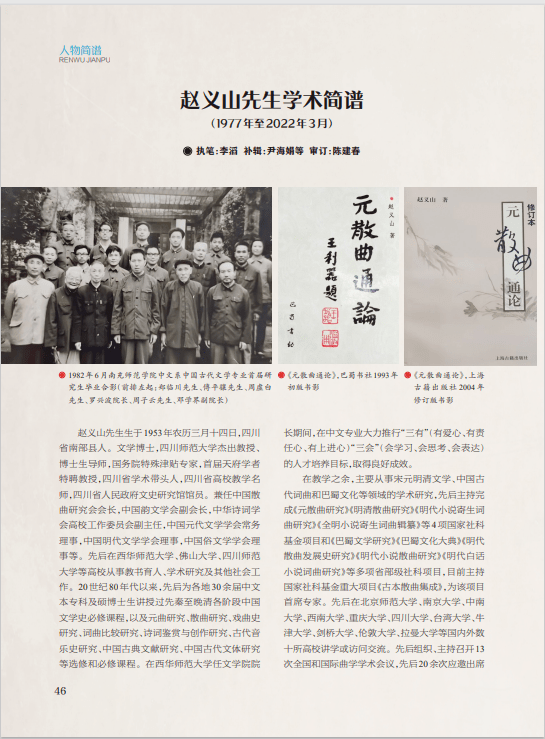 “人物简谱”为本刊新设栏目,刊发《赵义山先生学术简谱(1977年至2022年3月)》一文。本文以大事记的形式,系统梳理文学博士,四川师范大学杰出教授、博士生导师,国务院特殊津贴专家,首届天府学者特聘教授,四川省学术带头人,四川省高校教学名师,四川省人民政府文史研究馆馆员赵义山先生在教学之余,对宋元明清文学、中国古代词曲和巴蜀文化等领域的学术研究历程及取得的丰硕成果。