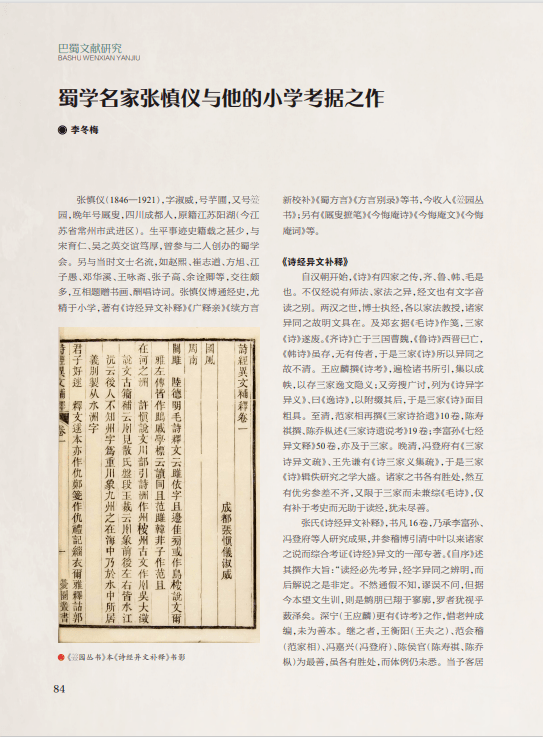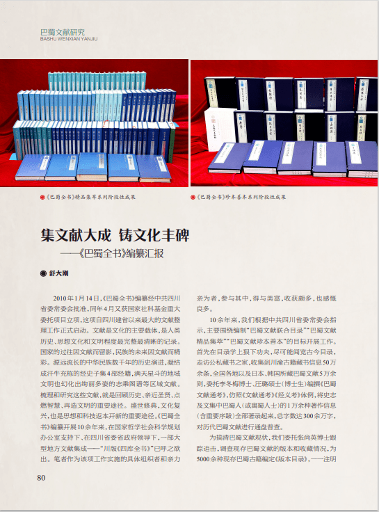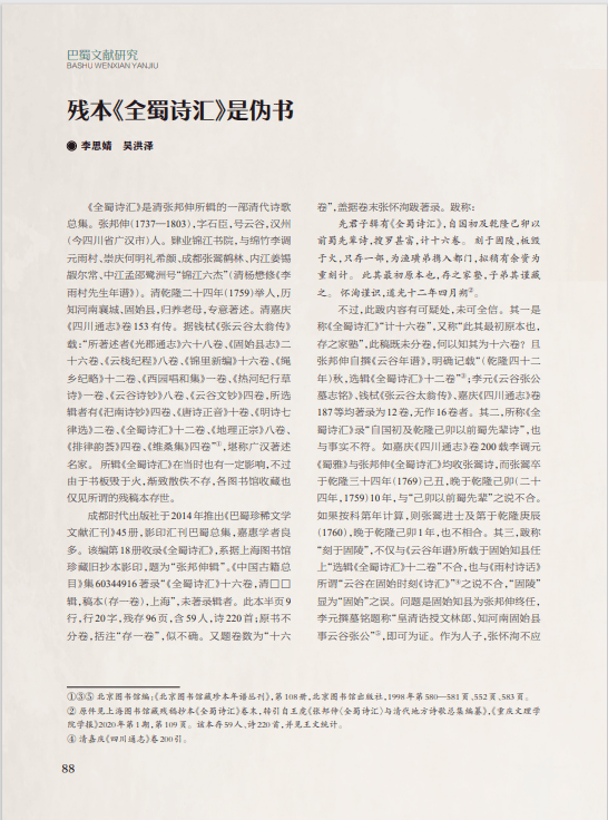 本期“巴蜀文献研究”栏目刊发《集文献大成 铸文化丰碑——〈巴蜀全书〉编纂汇报》《蜀学名家张慎仪与他的小学考据之作》《残本〈全蜀诗汇〉是伪书》3篇文章,介绍了《巴蜀全书》艰辛的编纂进程和取得的阶段性成果,再现了张慎仪在古籍整理上的成就和严谨学风,展示了对残本《全蜀诗汇》证伪的详实例证,对推进中共中央办公厅、国务院办公厅《关于推进新时代古籍工作的意见》落地落实,提升古籍整理研究水平、挖掘古籍时代价值、促进古籍有效利用,提供了有益借鉴。