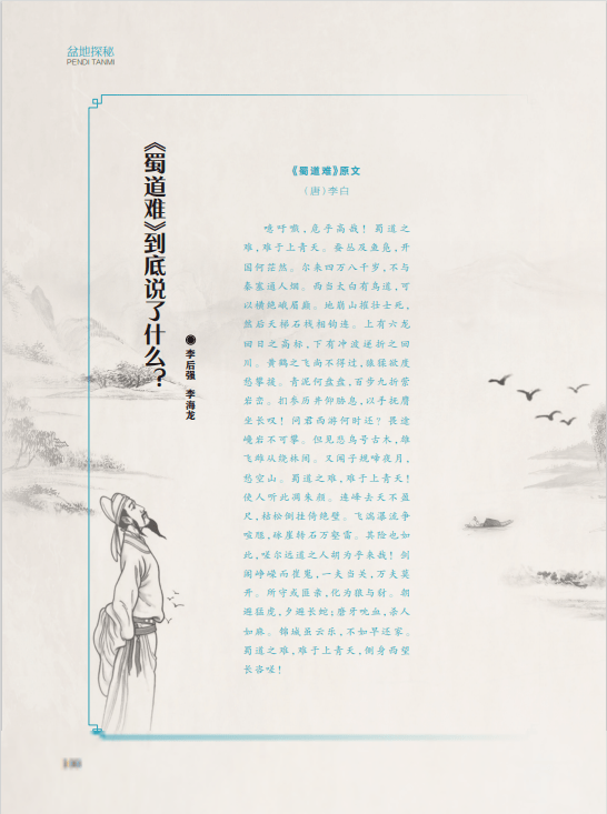 “盆地探秘”栏目刊发《〈蜀道难〉到底说了什么?》一文,作者以诗仙李白的名篇《蜀道难》为研究对象,从李白的家事身世、人生历程的角度一句一句解读,得出《蜀道难》并不是李白为描写蜀道的艰险而作,而是其述说家事身世太难的结论,为研究《蜀道难》提供了一个全新视角。
