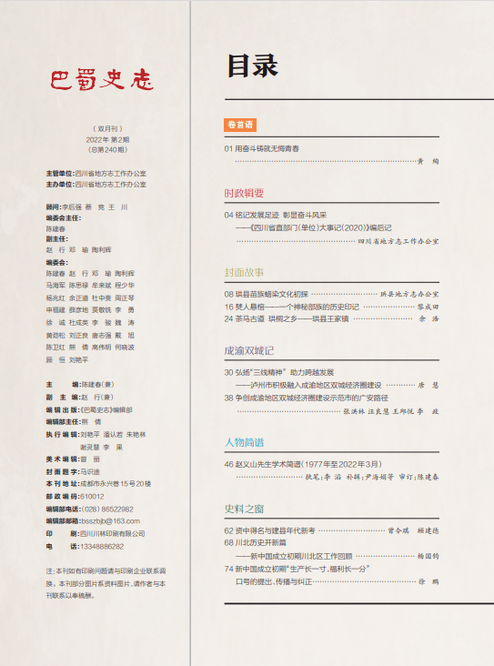 2022年5月12日,《巴蜀史志》2022年第2期公开出版发行。本期设“时政辑要”“封面故事”“成渝双城记”“人物简谱”“史料之窗”“巴蜀文献研究”“历史文化”“盆地探秘”“《中国省别全志·四川省》评析”“往昔追忆”“方志动态”11个栏目,发表21篇文章,20余万字。