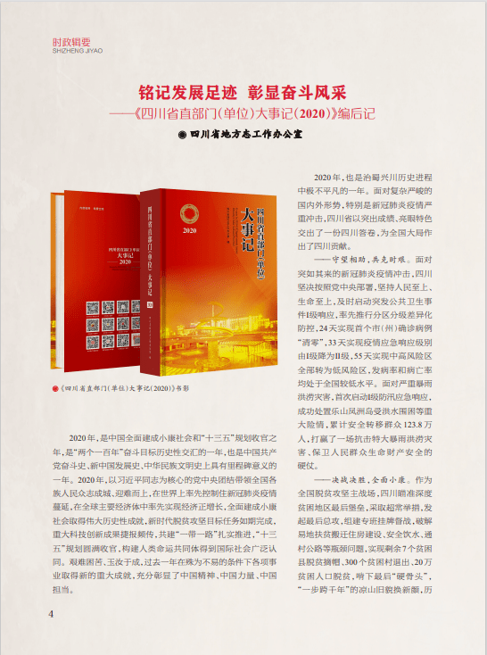 本期“时政辑要”刊发《铭记发展足迹 彰显奋斗风采——〈四川省直部门(单位)大事记(2020)〉编后记》,介绍2021年底省地方志办编纂出版《四川省直部门(单位)大事记(2020)》一书的重点内容及编纂特色,记述面对复杂严峻的国内外形势,特别是受新冠肺炎疫情严重冲击,中共四川省委、四川省人民政府在党中央坚强领导下,团结带领全省各族人民积极投身治蜀兴川的壮丽实践,以突出成绩交出的一份四川答卷,为全国大局作出四川贡献。