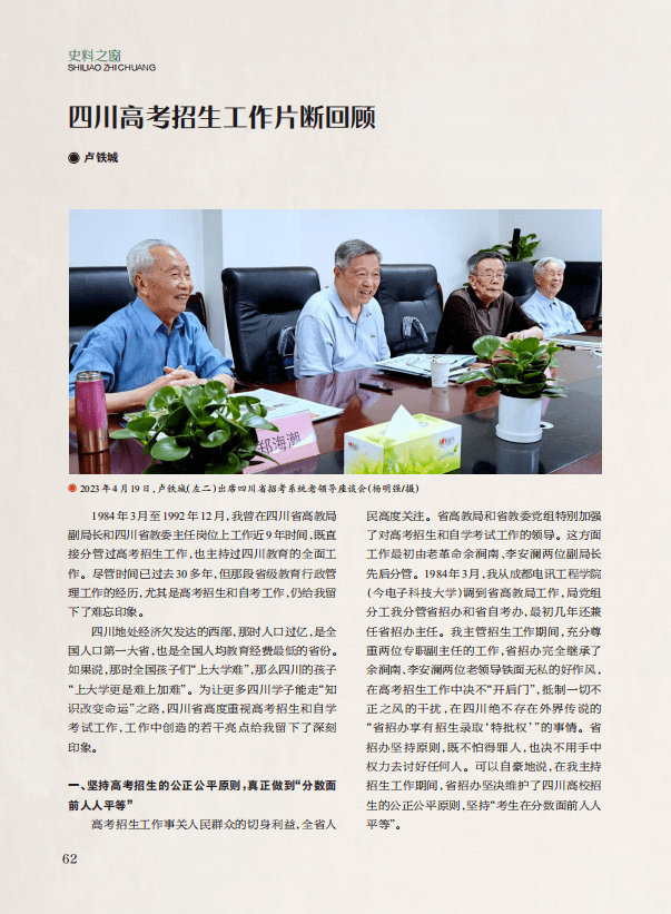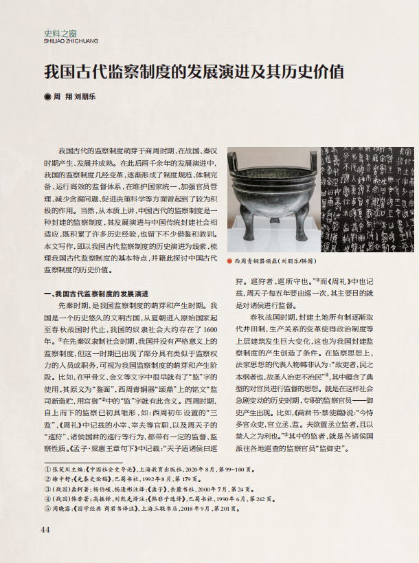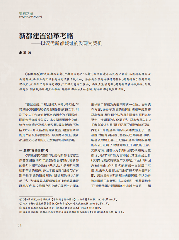 “史料之窗”栏目,刊发《我国古代监察制度的发展演进及其历史价值》《阳泉地望及其对德阳绵竹两县历史沿革的误导——从绵竹故城遗址、金土村遗址研究到德阳政区史的重构之二》《新都建置沿革考略——以汉代新都城址的发现为契机》《四川高考招生工作片断回顾》《中国——日本税收协定缔结过程和我参加准备工作与谈判的回忆》5篇文章,分别以我国古代监察制度的历史演进为线索,梳理我国古代监察制度的基本特点,并探讨中国古代监察制度的历史价值;通过史料分析考证阳泉地望及其对德阳绵竹两县历史沿革的误导,并分析探讨了史料中有关德阳历史沿革错讹、与史实不符的问题;利用历史文献,结合文物遗存及考古新发现,截取新都(不包括1965年并入新都的原新繁县)建置沿革中的几个阶段作简要辨析;通过回忆自己在四川省高教局和四川省教委工作期间主持教育工作和分管高考招生的经历,梳理了四川高考招生工作的发展历程、改革经验、突出亮点,对推进新时期高考招生工作高质量发展具有重要现实启示;通过回忆参加我国历史上第一次同外国签订避免双重征税协定,缔结工作与谈判全部过程,展示我国缔结国际税收协定工作的艰辛历程,对当今进行双边税收协定谈签提供经验和启示。
