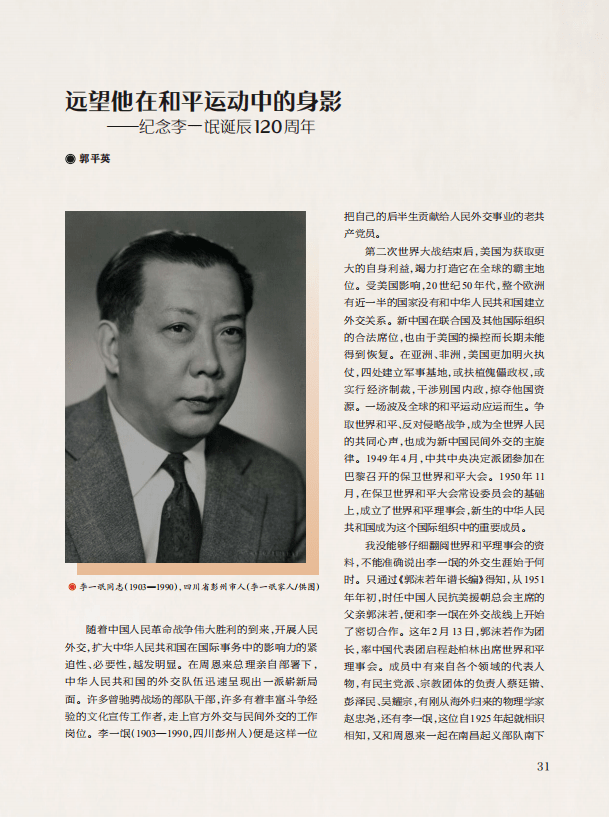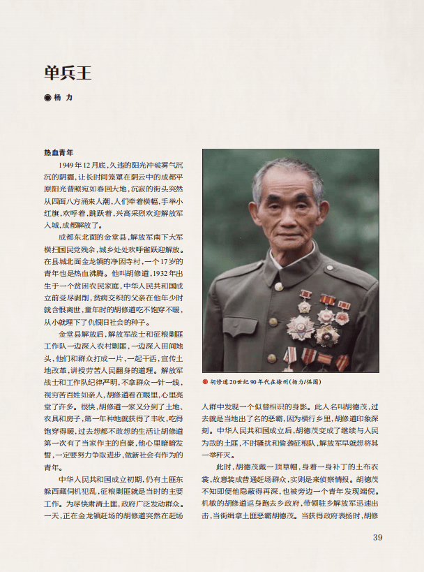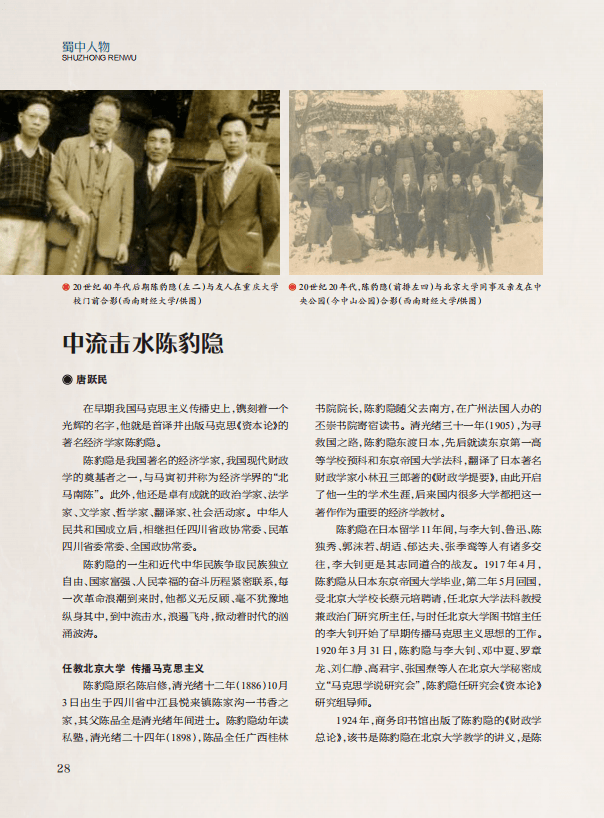 “蜀中人物”栏目,刊发《中流击水陈豹隐》《远望他在和平运动中的身影》《杨虎城“以身殉志”的最后岁月》《单兵王》4篇文章,讲述了我国著名经济学家、我国现代财政学奠基人之一陈豹隐对马克思主义在中国的传播作出的贡献,以及他投身革命,不断追求进步的一生;介绍了坦荡博学的外交家李一氓的光辉业绩,颂扬了李一氓的崇高品德,表达了对李一氓的哀思与怀念;记述了杨虎城将军“以身殉志”的悲壮人生,分析探讨了围绕将军的几个未澄清的问题,披露了鲜为人知的史实细节;介绍了金堂籍中国人民志愿军胡修道用自己的一生,实践了生死面前是英雄,荣誉面前堪称模范的光辉形象,抒写和诠释了伟大的抗美援朝精神,表达了对革命先辈的尊崇和敬仰。