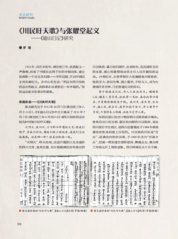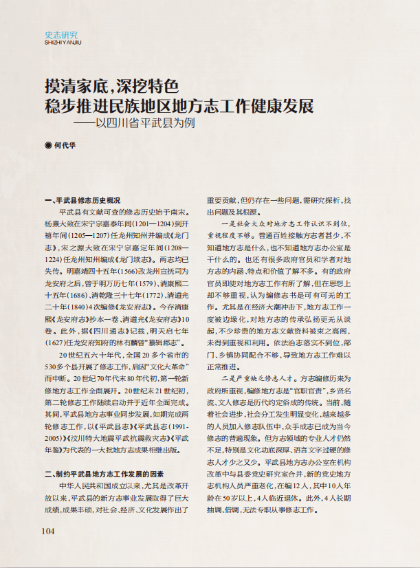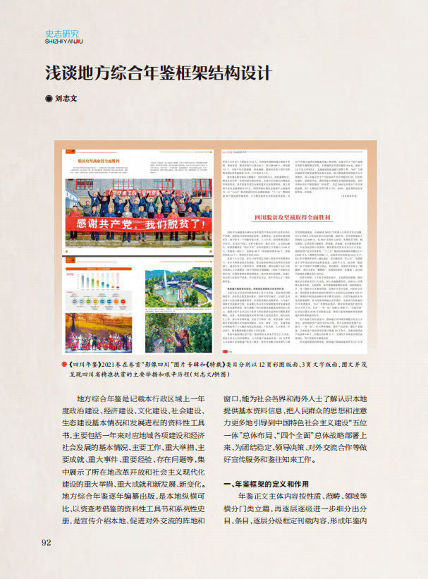 “史志研究”栏目,刊发《浅谈地方综合年鉴框架结构设计》《〈川民吁天歌〉与张耀堂起义——〈迪山日记〉研究》《摸清家底,深挖特色稳步推进民族地区地方志工作健康发展——以四川省平武县为例》3篇文章,分别探讨了地方综合年鉴框架结构设计;通过对《迪山日记》研究,梳理了保路民谣《川民吁天歌》与保路运动张耀堂起义的历史背景、发展原因和起始过程;以平武县为例,探讨了推进民族地区地方志工作健康发展的路径和方法。